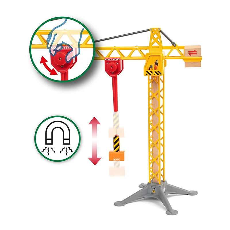 Der Großer Baukran mit Licht ist fast einen halben Meter hoch und kann jede Bauaufgabe in der BRIO World bewältigen. Das Heben von Fracht und das Ausführen von Bauaufgaben hat noch nie so viel Spaß gemacht wie mit diesem voll funktionsfähigen Spielzeug-Baukran – ausgestattet mit einem um 360 Grad drehbaren Turm, Kabine und Magnethaken. Alle Arbeiter am Boden schauen, wann die Lichter am Kran angehen, damit der Kranführer mit seiner Arbeit beginnen kann.