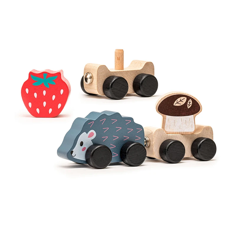 Das Set besteht aus einer Igelfigur, 2 Waggons, einer Pilzfigur und einer Erdbeere. Die Igelfigur und die Waggons haben drehbare Räder und Magnethalterungen, um sie miteinander zu verbinden. Auf den Sockeln befinden sich Holzstifte, auf denen Sie den Pilz und die Erdbeere platzieren können. Pilz und Erdbeere haben jeweils Löcher zum Auffädeln an einer Nadel. Die Magnete an den Waggons sind fest fixiert, was das Spielzeug so sicher wie möglich macht. Zwischen sich halten die Magnete fest und die Elemente fallen bei Gebrauch nicht auseinander.