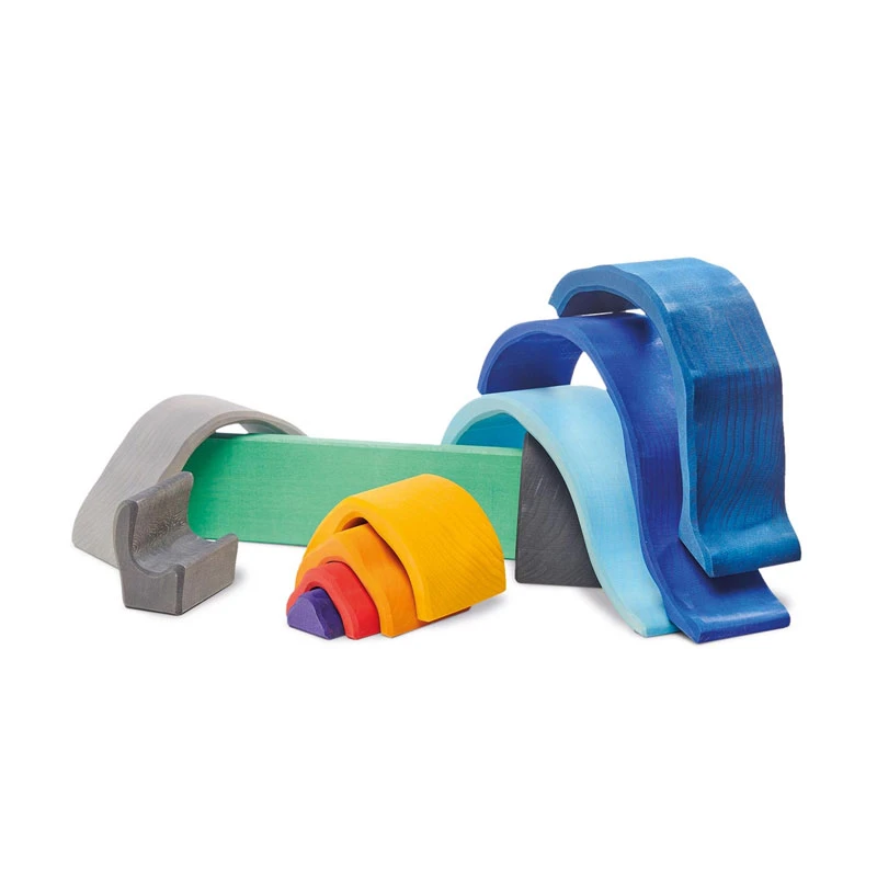 Der Vielfalt keine Grenzen gesetzt. Kreativ und bunt, anziehend. Die Formen sind aus hochwertigem Lindenholz hergestellt und ergeben eine besondere Haptik durch die gebeizten Oberflächen. Kinder und Eltern werden zu individuellen Baumeistern, ob „befeuert“ oder verträumt in Gedanken-