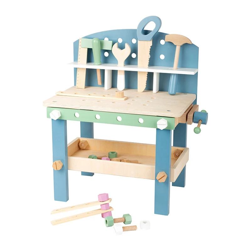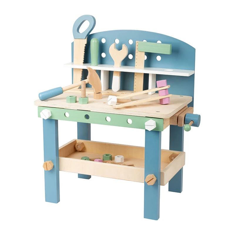 Kompaktes Heimwerken im skandinavischen Stil! Mit dieser Werkbank aus Holz kann auf kleiner Spielfläche handwerkliches Geschick erprobt werden. Durch Drehen, Sägen und Schrauben werden feinmotorische Fähigkeiten geschult. Sanfte Farben, klare Formen und das schlichte nordische Design sprechen Mädchen und Jungs gleichermaßen an. Inkl. 21-teiligem Zubehör aus 5 Schrauben, 5 Muttern, 3 Nägeln, 3 Lochleisten und 5 Werkzeugen. Hier können die kleinen Handwerker schon beim Aufbau unterstützen und sich über das Ergebnis freuen. Die Werkzeuge und Zubehörteile können platzsparend verstaut werden und sind so immer griffbereit. Ein kompaktes Rollenspielzeug fürs Kinderzimmer! Passt durch das schlichte Design zu jeder Wohnungseinrichtung.
