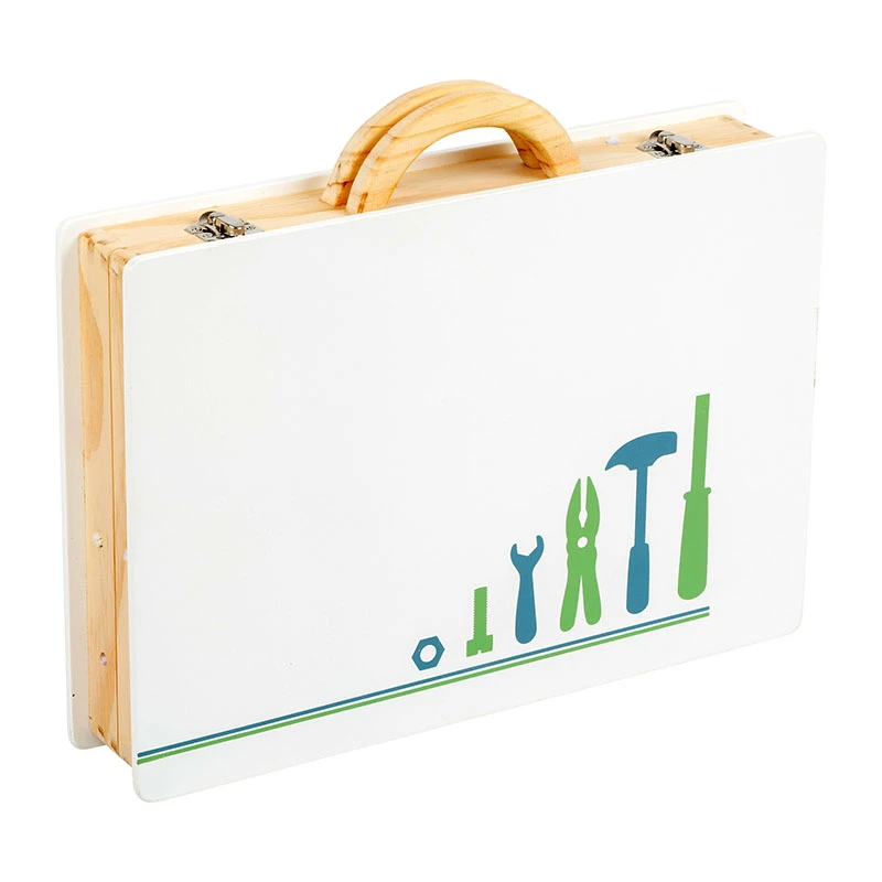 Jetzt geht das Heimwerken richtig los! Mit diesem Werkzeugkoffer aus Holz im skandinavischen Design werden kleine Handwerker zu echten Profis. Detailreiche Zubehörteile, wie z.B. ein Lineal mit integrierter Wasserwaage und ein handlicher Akkuschrauber, der seine Bits mithilfe von Magneten wechseln kann, lassen keine Wünsche offen! Inkl. 43-teiligem Zubehör aus 5 Werkzeugen, 1 Bohrer, 3 Bits, 11 Schrauben, 11 Muttern und 12 Lochleisten. Durch die Klippverschlüsse lässt sich alles sicher verstauen und mit den Tragegriffen aus Holz ist der Werkzeugkoffer für Jungen und Mädchen bereit für den nächsten Heimwerkereinsatz.