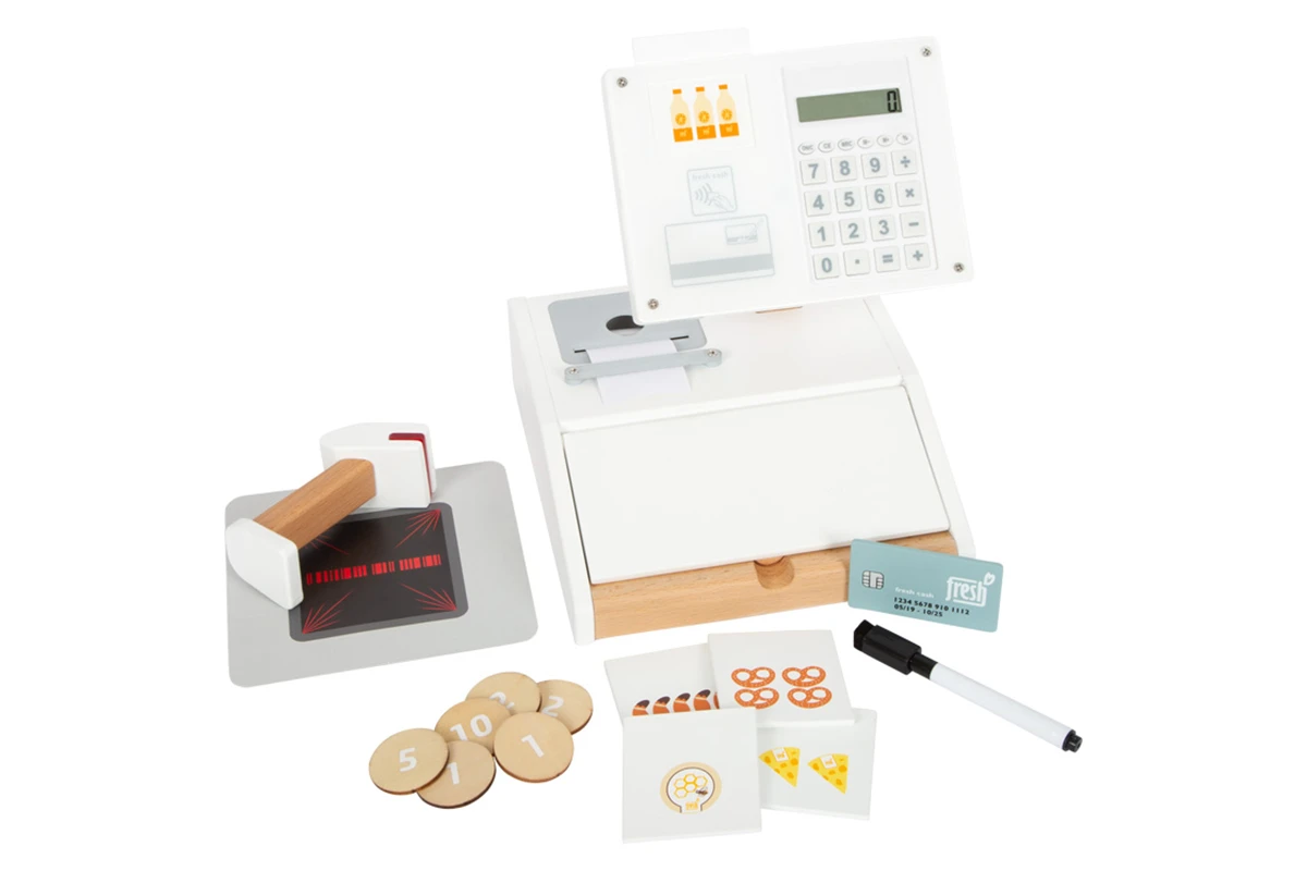 Eine einzigartige, optisch moderne Holzkasse, die mit viel Zubehör und zahlreichen Funktionen das Einkaufen im Kaufmannsladen noch realistischer macht! Ausgestattet mit Handscanner, Papier-Bonrolle, Monitor, aufklebbarer Scanfläche, Geld- und Produktkarten sowie doppelseitig bedruckten Geldstücken aus Holz lässt diese Spielkasse keine Wünsche offen. Highlights sind der in den Monitor integrierte, echte Taschenrechner sowie das zweigeteilte Kassenfach, das sich wie eine echte Supermarkt-Kasse nach oben hin öffnen lässt. Inkl. abwischbarem Stift mit integriertem Schwamm zum Unterschreiben auf der Acrylglasfläche. Batterien nicht enthalten.