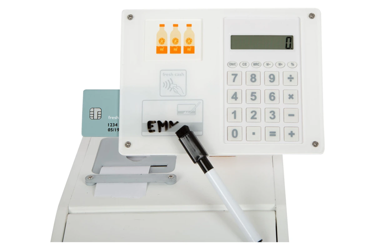 Abkassieren wie im Supermarkt? Dann darf diese Spielkasse aus der Produktlinie „Fresh“ in einem gut sortierten Kaufmannsladen auf keinen Fall fehlen! Die aufklebbare Scanfläche kann dazu ganz einfach auf einen bestehenden Kaufladen oder eine andere Spielfläche aufgeklebt werden. Das spielerische Kassieren trainiert den Umgang mit Geldbeträgen und Preisen und die 15 Geldstücke sind so gestaltet, dass sie zum Üben erster Rechenoperationen genutzt werden können. Auch die 5 beidseitig bedruckten Lebensmittelkärtchen animieren zum Zählen und Rechnen lernen. Wer lieber tippt, statt zu rechnen, kann die Preise für gekaufte Waren ganz einfach über die Tastatur des integrierten, echten Taschenrechners eingeben. Die hochwertige Verarbeitung mit robustem Holz und Acrylglas macht die Kaufladen-Kasse zu einem echten Hingucker im Kinderzimmer, der langanhaltenden Spielspaß verspricht!